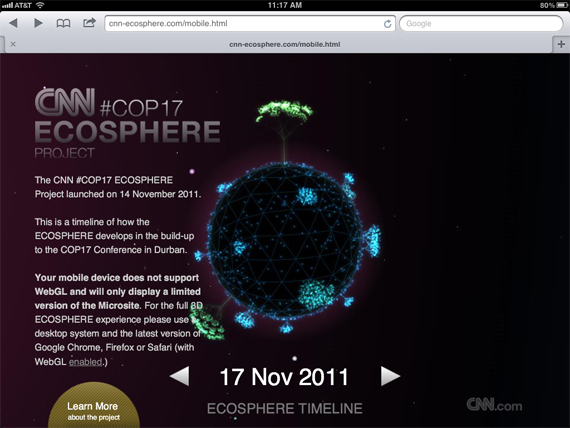 World leaders are about to meet in Durban at the COP17 Conference on Climate Change to make crucial decisions for the future of our planet. Add your voice to the global discussion and the ECOSPHERE Project will bring your thoughts to the conference via a state of-the-art digital installation. (via CNN Ecosphere)