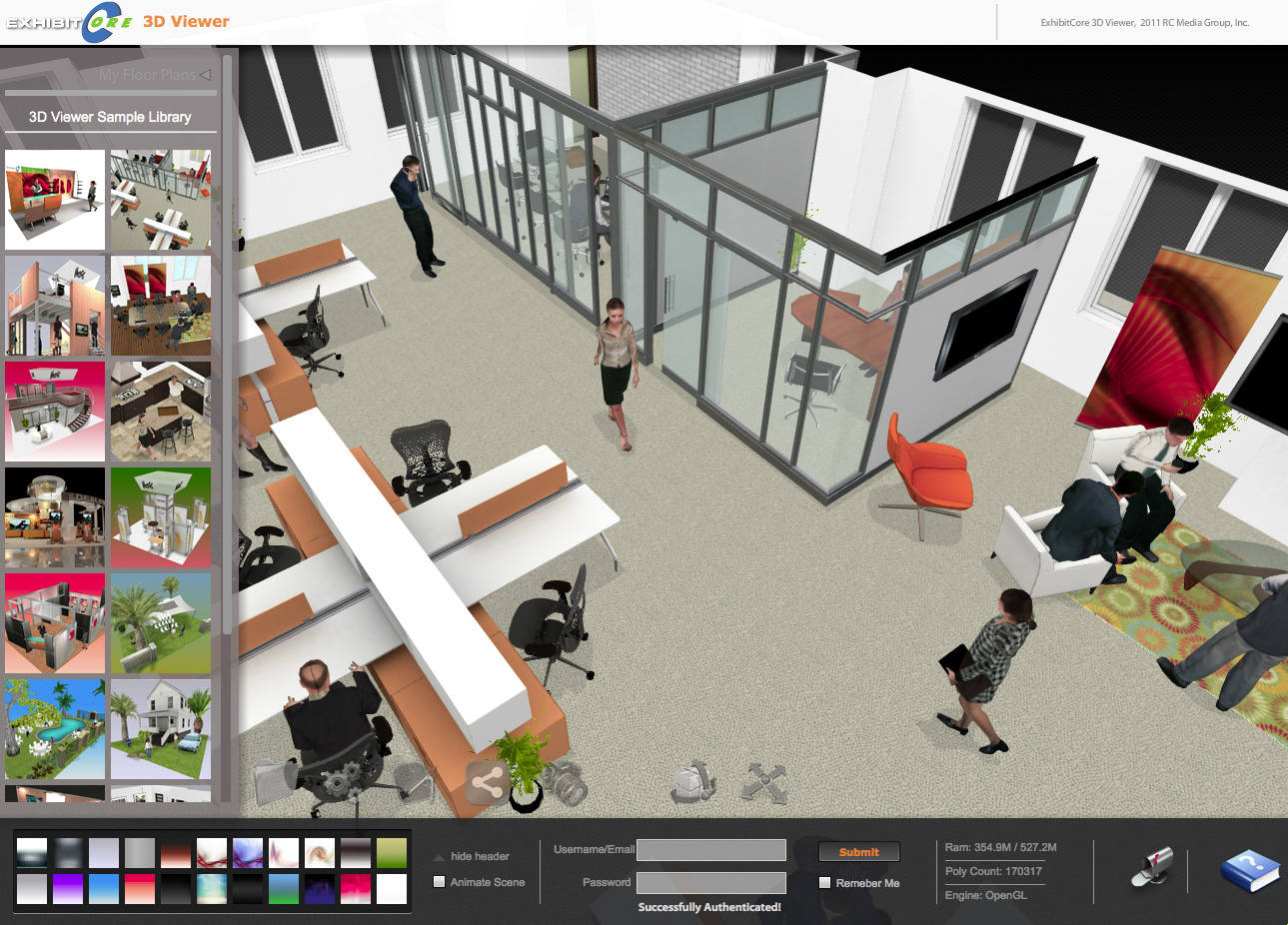 A comprehensive Apache Flex powered editor, free in the basic version, allows the placement of complex objects in a virtual environment, and to rotate, move and scale them. It includes a set of free 3D inventory, and paid premium furniture, including popular office items like Aeron chairs. Overall the complexity of the editor is impressive.