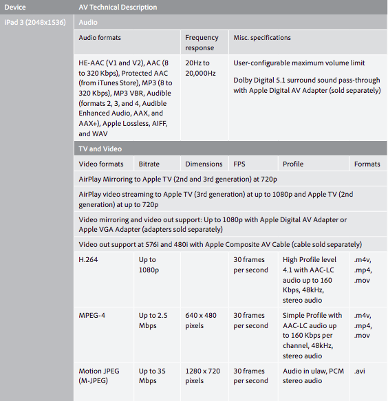 To showcase the level of detail, here are the video specifications for the new iPad (aka iPad 3).