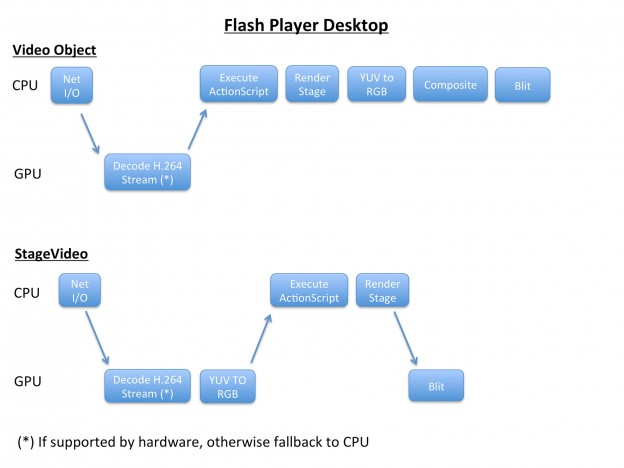 StageVideo enables full HW acceleration of the Flash Player video pipeline. It contains the following operations performed by the GPU: