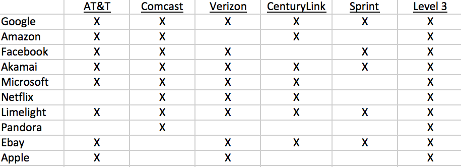 Based on the AS lookups I did, here are the companies that have direct interconnects with various ISPs. I didn’t look at every ISP out there or every content owner, simply some of the larger ones. [via StreamingMediaBlog.com]