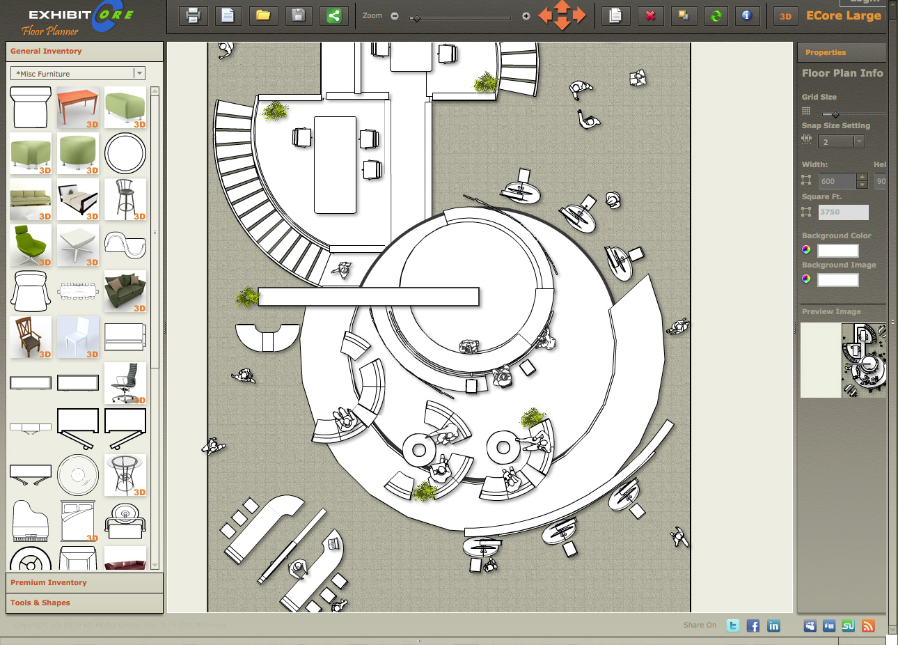 A comprehensive Apache Flex powered editor, free in the basic version, allows the placement of complex objects in a virtual environment, and to rotate, move and scale them. It includes a set of free 3D inventory, and paid premium furniture, including popular office items like Aeron chairs. Overall the complexity of the editor is impressive.