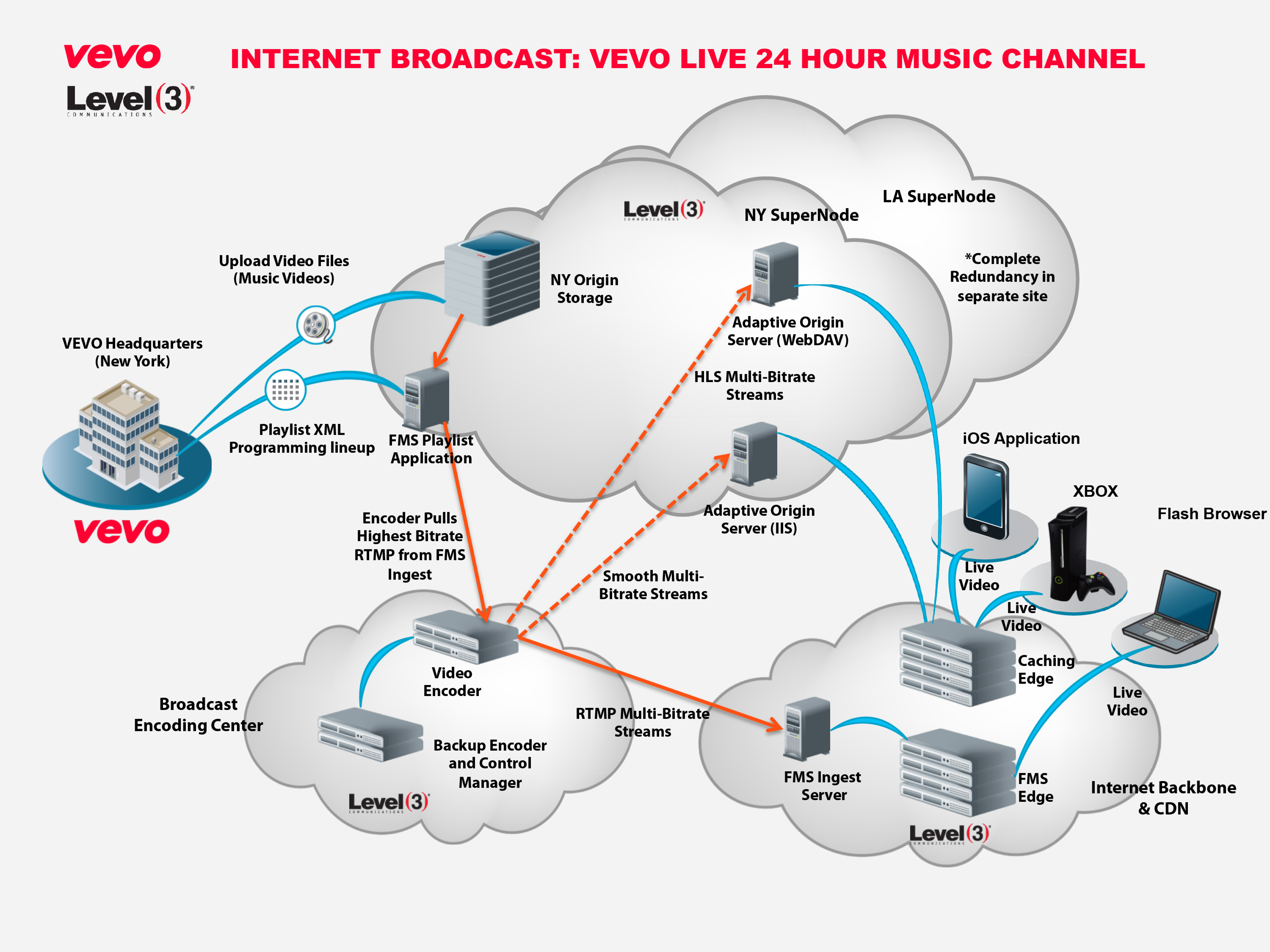 VEVO's live stream setup involves other components such as a transcoding layer and output options to multiple video formats. It seems to be a scalable solution, and an interesting showcase how to bring a simple concept to the next level.